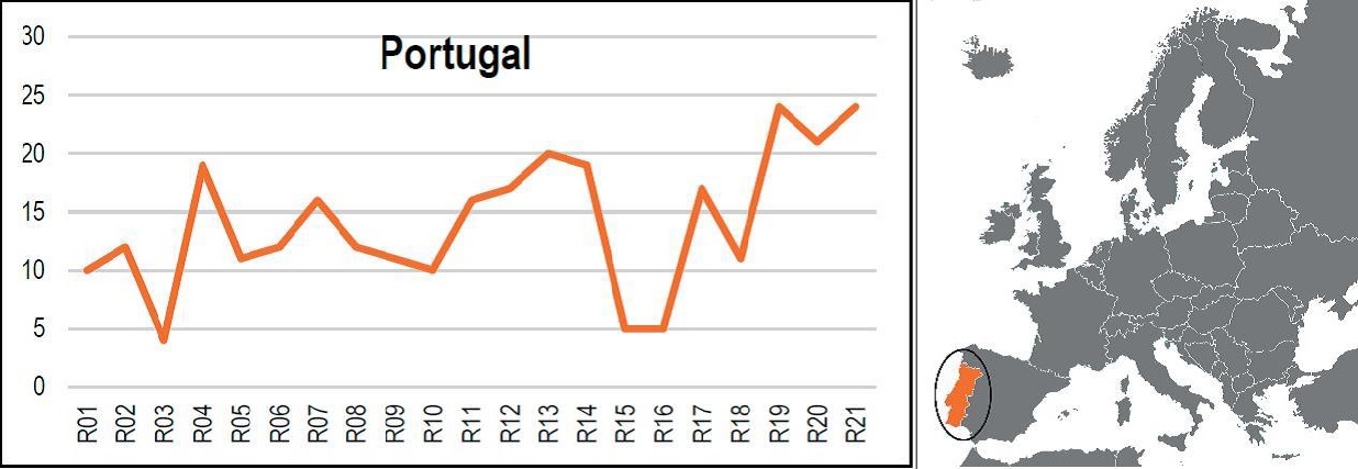 A observação das posições relativas alcançadas pelo nosso país, quer para cada um dos 21 indicadores (R01 a R21 na Figura), quer de forma agregada, permitem retirar o seguinte conjunto de constatações essenciais: